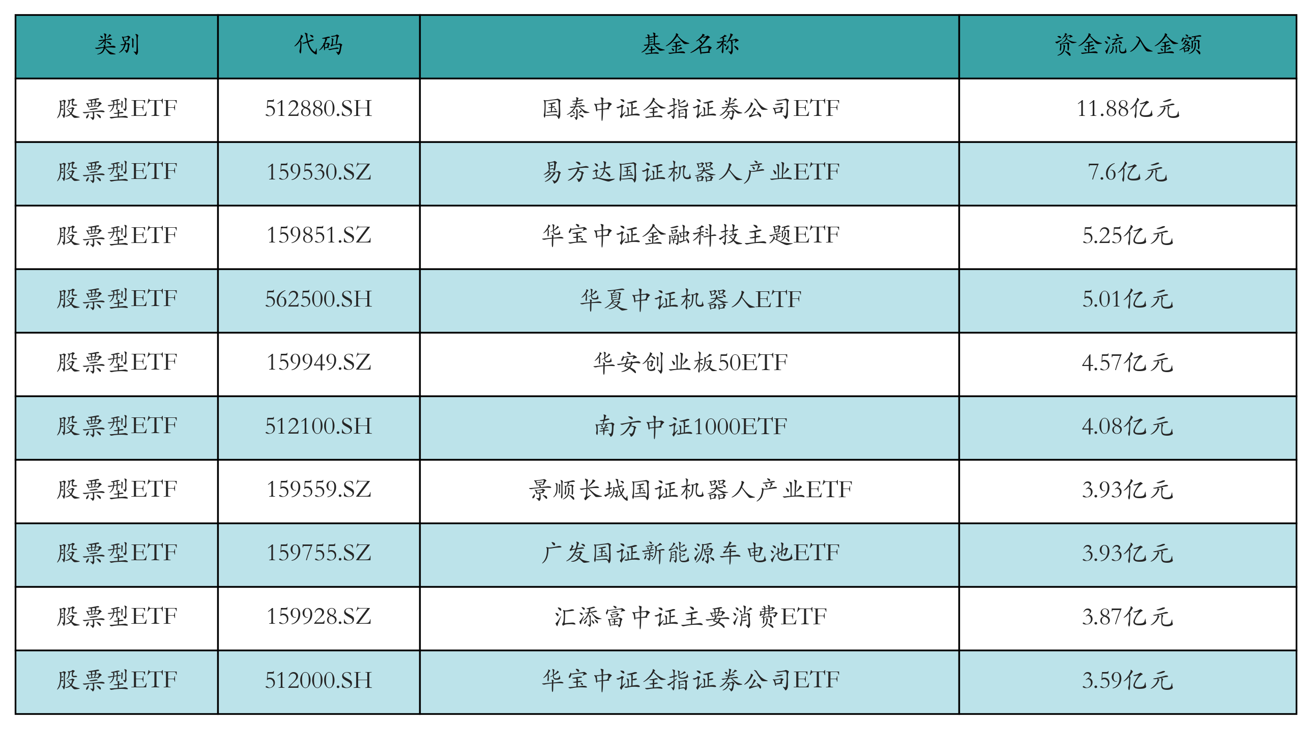 昨日股票型ETF资金流入最多的3只ETF及其流入金额分别为:国泰中证全指证券公司ETF(流入11.88亿元)、易方达国证机器人产业ETF(流入7.6亿元)、华宝中证金融科技主题ETF(流入5.25亿元)。资金流入前10详情见下表: