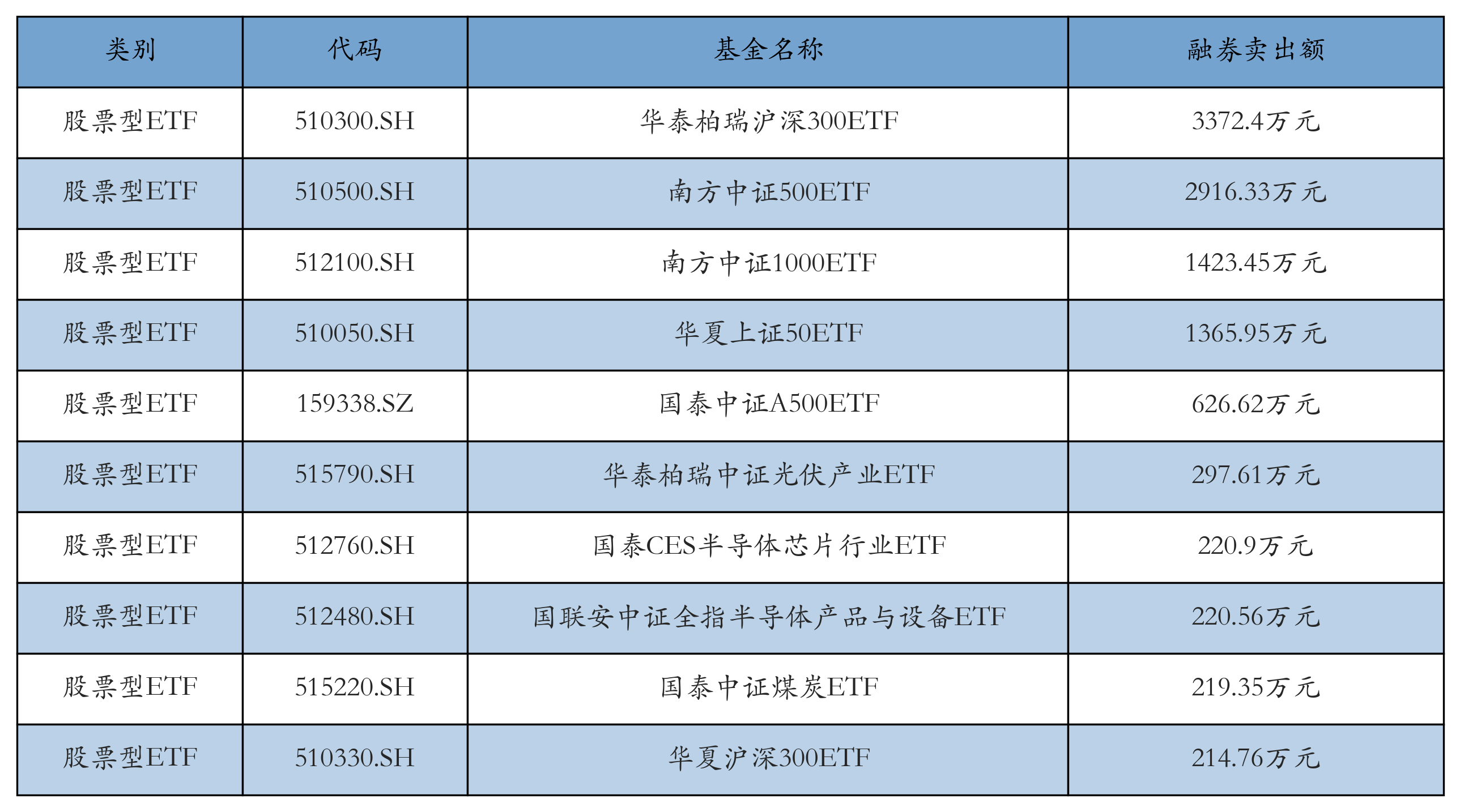 昨日股票型ETF融资卖出额最高的3只ETF及其卖出金额分别为:华泰柏瑞沪深300ETF(3372.4万元)、南方中证500ETF(2916.33万元)、南方中证1000ETF(1423.45万元)。融券卖出额前10详情见下表: