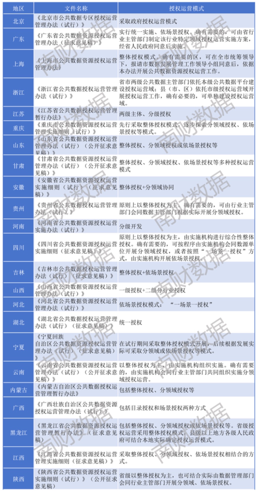 据南财数据团队统计,截至今年9月,全国已有23个省级地方政府制定了公共数据授权运营管理办法,大多处于公开征求意见阶段。其中,有半数省级地方政府明确,以区域整体授权为主要授权运营模式,如提出分省、市两级开展分级授权。