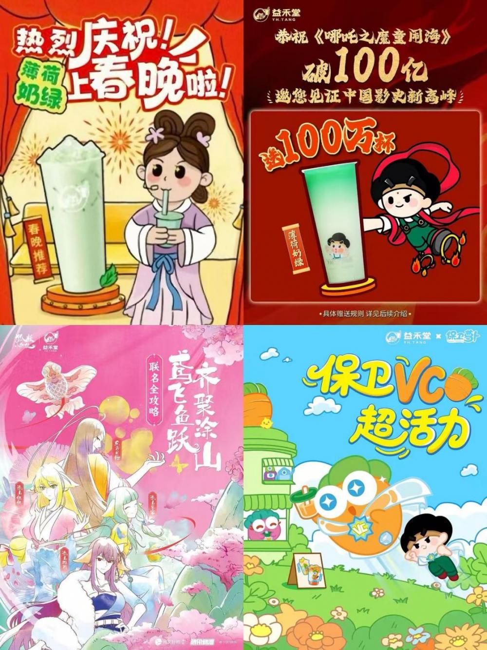 在营销层面,益禾堂展现出与年轻群体深度共鸣的非凡能力。品牌巧妙运用热点话题、校园场景与跨界联名等多种方式,与年轻人建立情感连接。从春节联欢晚会小品中“薄荷奶绿”的意外走红,到借势《哪吒2》票房佳绩的创意营销;从武大樱花季的浪漫快闪,到与小米之家的科技跨界;从与《狐妖小红娘》《魔道祖师》等经典国漫的深度IP合作,到携手《保卫萝卜》等国民级手游开展沉浸式内容共创……益禾堂不断构建着与年轻消费者对话的多元场景。这些创新营销举措不仅有效提升了品牌曝光度,更让消费者在享受茶饮的同时,感受到品牌所传递的青春活力与文化内涵。