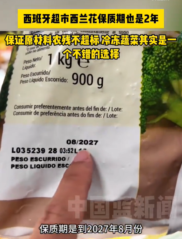 另据@中国蓝新闻,住在西班牙的美食博主走访了西班牙当地的超市,博主发现在超市里也有冷冻西兰花在售卖,保质期也是2年。