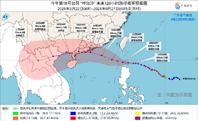 根据中央气象台消息,9月22日10时,“桦加沙”(超强台风级)将于23日凌晨进入南海东北部海面,随后向西偏北方向移动,并逐渐向广东中西部至海南岛东北部一带沿海靠近,强度稍有减弱。