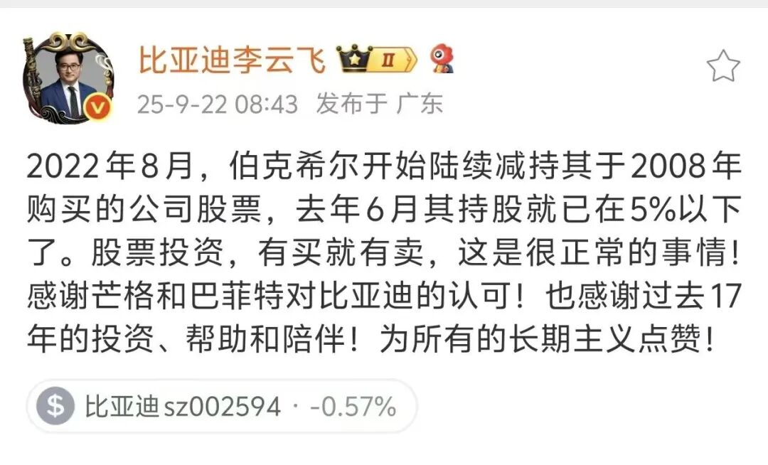 9月22日早间,比亚迪集团品牌及公关处总经理李云飞在社交平台发文回应称,2022年8月,伯克希尔开始陆续减持其于2008年购买的公司股票,去年6月其持股就已在5%以下了。