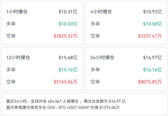 CoinGlass数据显示,截至15时,24小时虚拟货币全网爆仓人数超40万,爆仓总金额近17亿美元。