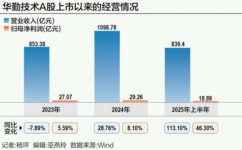 A股上市以来,华勤技术维持了稳健的增长态势。2024年,华勤技术收入突破千亿——实现营业收入1099亿元,同比增长超过28%,实现归母净利润29.26亿元,同比增长8.10%。2025年上半年,华勤技术在高基数上再度实现营业收入839.4亿元,同比增长113.1%;归母净利润18.89亿元,同比增长46.3%。