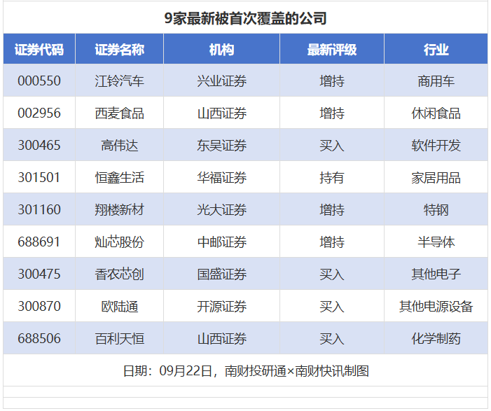 首次覆盖方面,9月22日券商共给出了9次首次覆盖,其中江铃汽车获得兴业证券给予“增持”评级,西麦食品获得山西证券给予“增持”评级,高伟达获得东吴证券给予“买入”评级,恒鑫生活获得华福证券给予“持有”评级,翔楼新材获得光大证券给予“增持”评级。