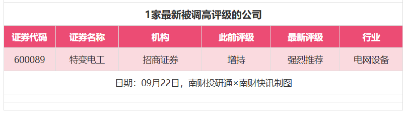 评级调高方面,9月22日,券商调高上市公司评级达到1家次,最新数据包括了招商证券对特变电工的评级从“增持”调高至“强烈推荐”。