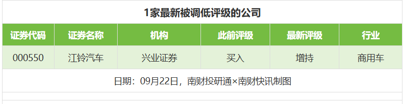 评级调低方面,9月22日,券商调低上市公司评级达到1家次,最新数据包括了兴业证券对江铃汽车的评级从“买入”调低至“增持”。