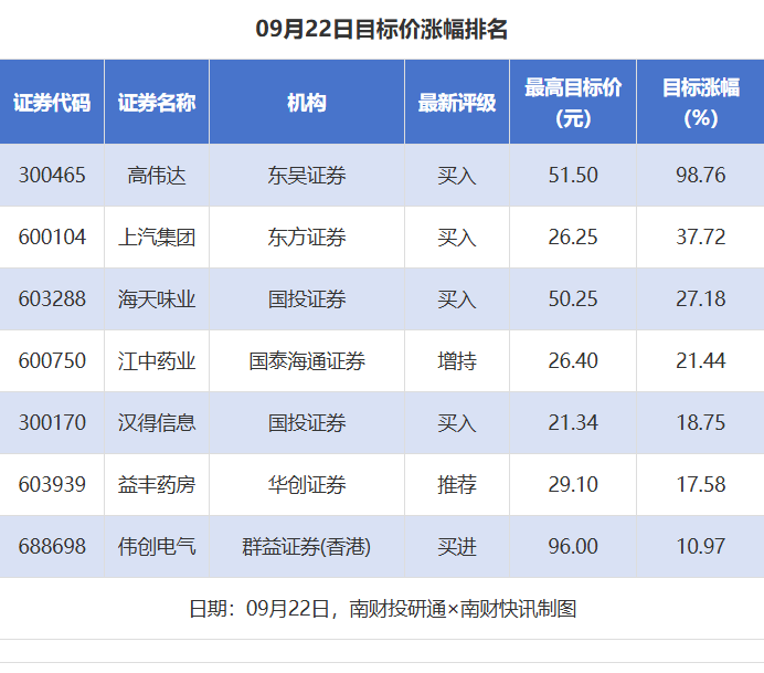 南财投研通数据显示,9月22日,券商给予上市公司目标价共7次,按最新收盘价计算,目标价涨幅排名居前的公司有高伟达、上汽集团、海天味业,目标价涨幅分别为98.76%、37.72%、27.18%,分别属于软件开发、乘用车、调味发酵品行业。