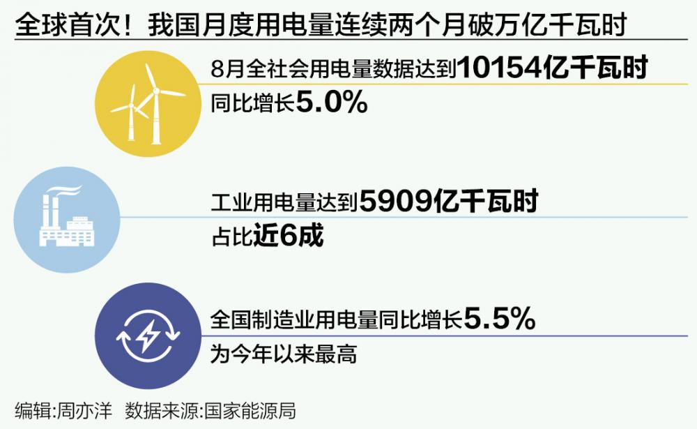 7、8月份连续两个月全社会用电量超万亿千瓦时,这在全球也是首次。用电量如此之高首先与夏季高温天气直接相关,高温高湿天气来得早、持续久,第三产业和居民空调等用电快速攀升,8月份这两项加起来就接近4000亿千瓦时,占比近四成。
