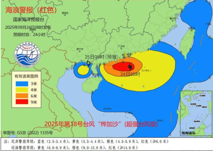 9月24日08时,国家海洋预报台发布海浪红色警报和风暴潮红色警报,受今年第18号台风“桦加沙”(超强台风级)影响,预计9月24日上午到25日上午,广东近岸海域将出现4到7米的巨浪到狂浪,预警级别为红色。