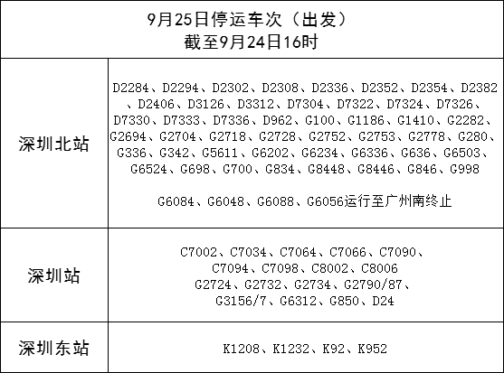 自9月25日零时起,广深港高铁、京港高铁、甬广高铁、杭深高铁、梅汕高铁、龙龙高铁、广深城际以及京九铁路等线路列车,将逐步恢复开行。