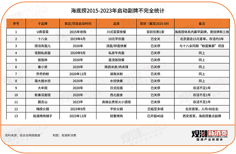 重大亏损促使海底捞重新审视副业节奏。海底捞先是暂时放缓了副业探索,关停大批子品牌,然后把精力聚焦在主品牌上。公开资料显示,海底捞在2023年推出过仅3个子品牌,分别是囿吉山、焰请烤肉铺子和小嗨火锅(原嗨捞火锅)。