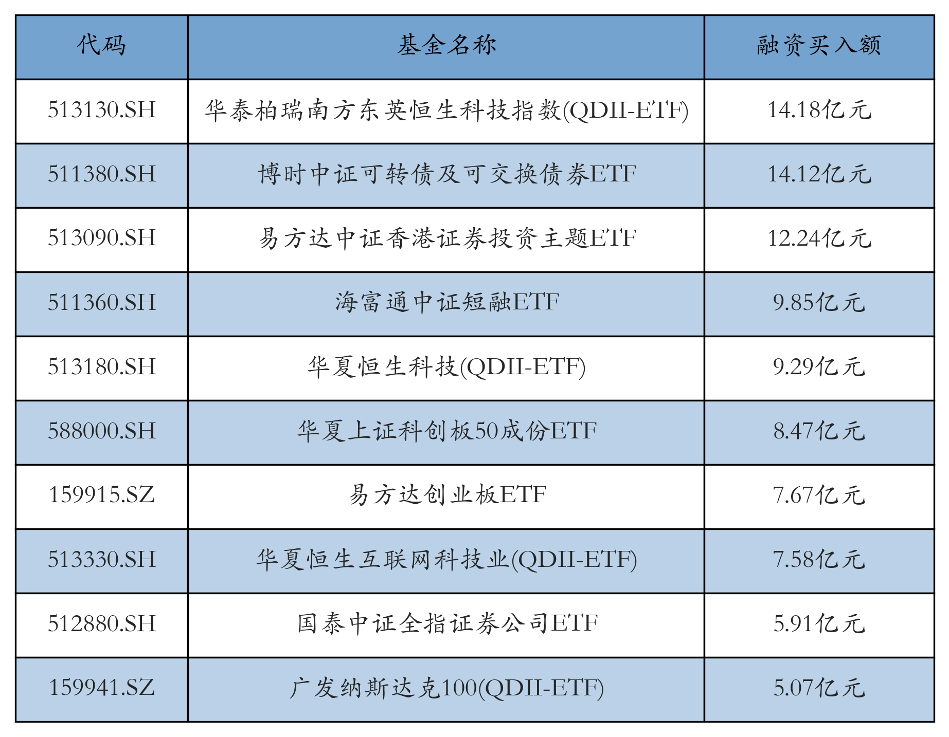 9月23日ETF融资买入额前三位分别为:华泰柏瑞南方东英恒生科技指数(QDII-ETF)(14.18亿元)、博时中证可转债及可交换债券ETF(14.12亿元)和易方达中证香港证券投资主题ETF(12.24亿元),前10具体见下表: