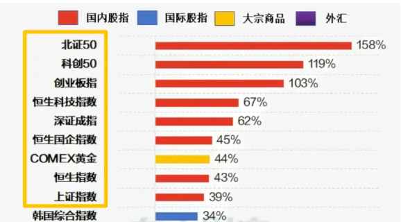 北证50暴涨158%领涨全球,创业板指数翻倍,恒生科技、深证成指涨幅超60%,恒生指数涨43%,沪指涨39%,中国资产领涨全球股市。