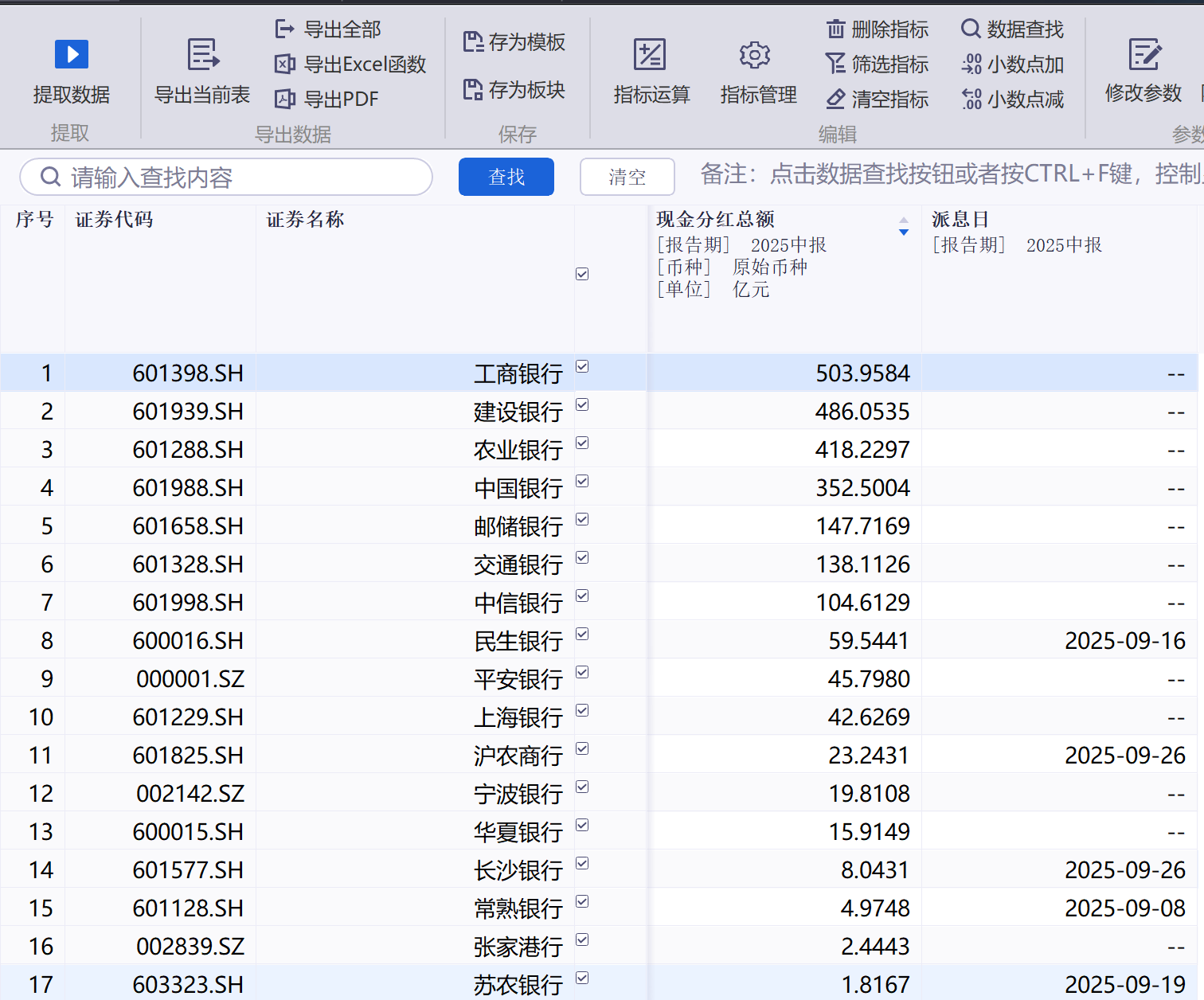 此外农业银行拟分红418.23亿元(含税),占2025年半年度归属于母公司股东净利润的比例为30.0%。中国银行中期分红的股息总额352.5亿元,派息比例继续保持在30%的水平。另外两家国有银行邮储银行和交通银行的中期分红分别是147.7亿元和138.1亿元。