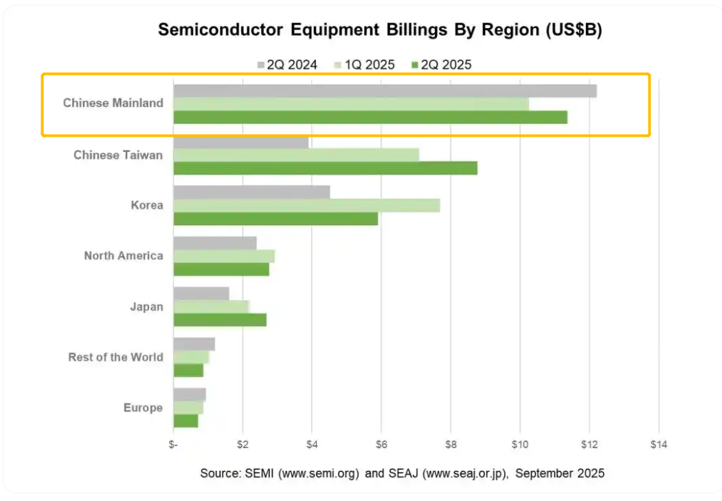 上海证券发布研报称,SEMI数据显示,2025年第二季度全球半导体设备出货金额达330.7亿美元,同比增长24%;中国大陆半导体设备销售额113.6亿美元,环比增长11%,以34.4%的市场份额首次超过三分之一,稳居全球第一大半导体设备市场。