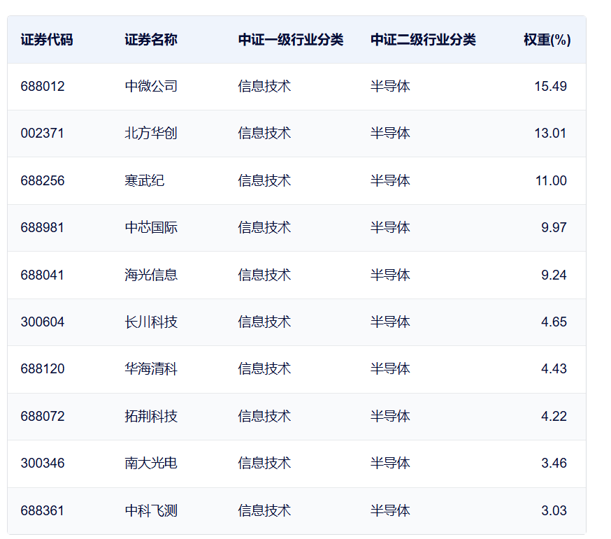 成分股集中度较高:前五大权重占比近59%,前十大成份股占比超78%,涵盖半导体设备材料龙头中微公司、北方华创、长川科技、华海清科、拓荆科技等股,同时也覆盖了三大设计龙头寒武纪、中芯国际、海光信息,指数集中度相对较高。