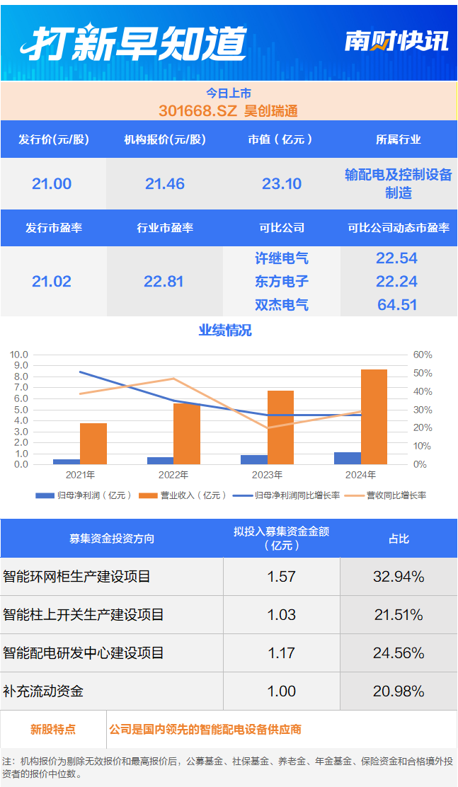 9月26日,有一只新股上市,为创业板的昊创瑞通(301668.SZ)。昊创瑞通成立于2007年,是一家专注于智能配电设备及配电网数字化解决方案的高新技术企业,主要从事智能配电设备的研发、生产和销售,产品包括智能环网柜、智能柱上开关和箱式变电站等。