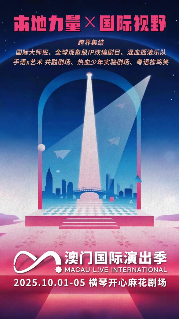 10月1-5日,澳门国际演出季将在横琴开心麻花剧场举行。开心麻花横琴将重磅发起【澳门国际演出季2025 Macau Live International】,通过本地力量×国际视野,为澳门演出团体搭建世界舞台,引进国际大师班滋养本地创作,跨界集结全球现象级IP改编剧目、混血摇滚乐队、手语x艺术 共融剧场、热血少年实验剧场、粤语栋笃笑,惠民活动一浪接一浪,公开幕后创作灵感,打造沉浸式艺术盛宴,开启澳琴观众的深度戏剧狂欢!
