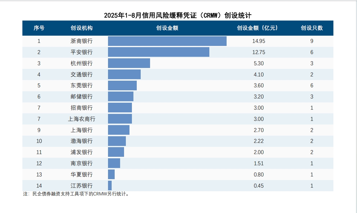 具体来看,信用风险缓释工具的创设机构方面,据交易商协会9月10日披露数据,浙商银行以14.95亿元的创设金额位居首位,共创设9只;平安银行紧随其后,创设金额达12.75亿元;杭州银行则以5.30亿元的创设金额位列第三。