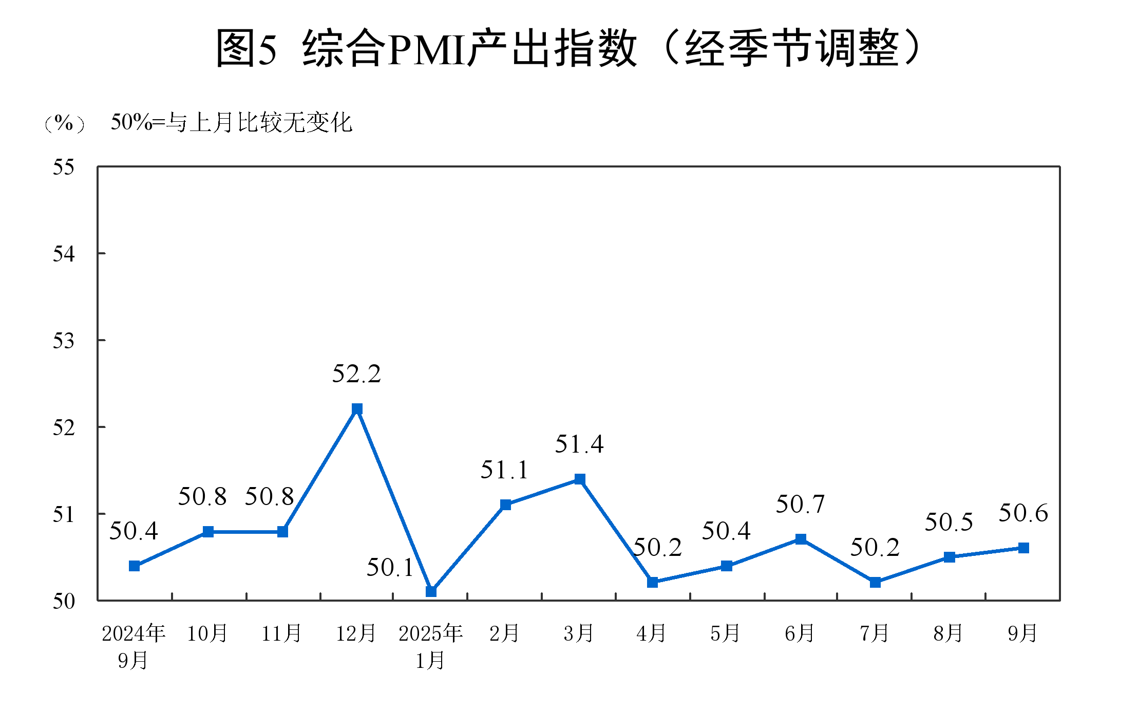 9月份,综合PMI产出指数为50.6%,比上月上升0.1个百分点,持续高于临界点,表明我国企业生产经营活动总体扩张继续加快。
