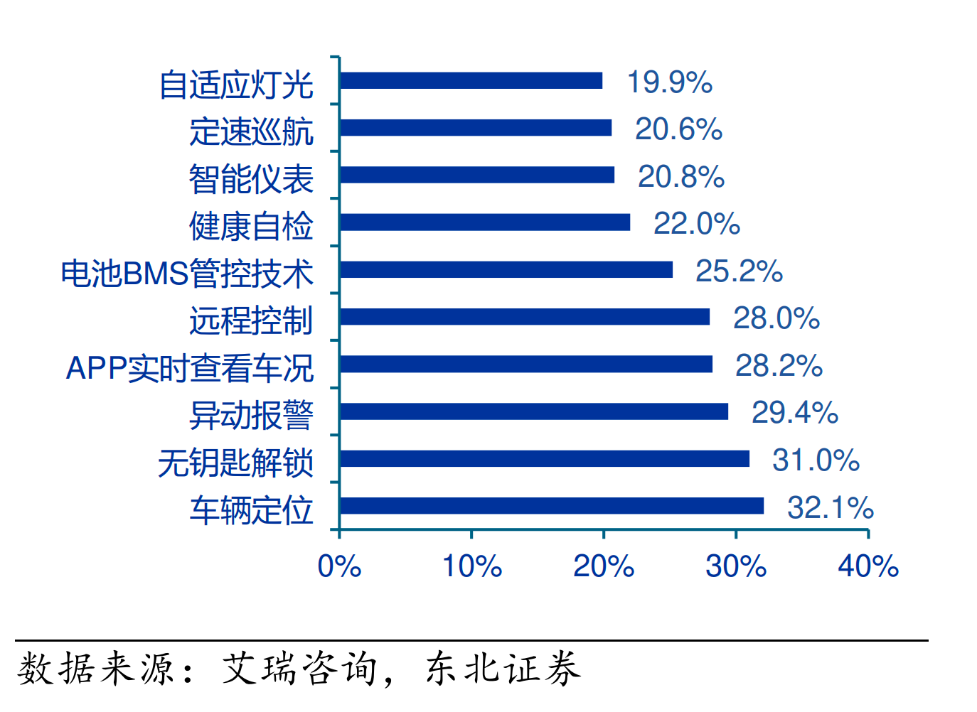 内卷的另一面是技术升级。东北证券在日前发布的一份研报中指出,目前,头部品牌已将无钥匙解锁、手机APP互联、远程控制、OTA升级等功能作为高端车型标配,81.5%的消费者更倾向购买智能化车型,车辆定位、异动报警、电池BMS管控等功能需求位居前列。