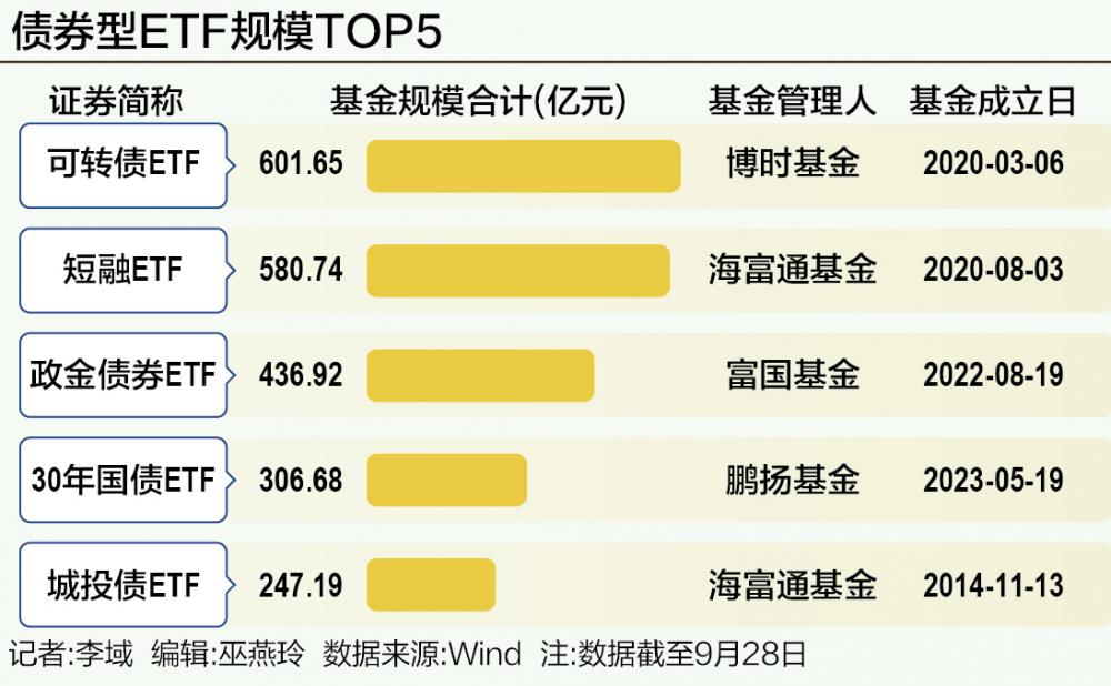 Wind数据显示,截至9月28日,32只债券型ETF规模突破百亿元大关,其中,博时可转债ETF规模突破600亿元,海富通短融ETF规模580亿元,规模位居前列。