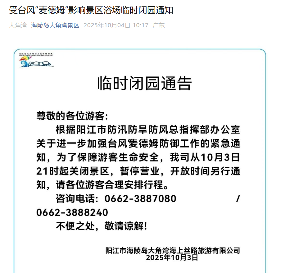 10月4日,珠海发布通告,受台风“麦德姆”外围环流影响,珠海将关闭滨海旅游景点(含沙滩)。具体为: