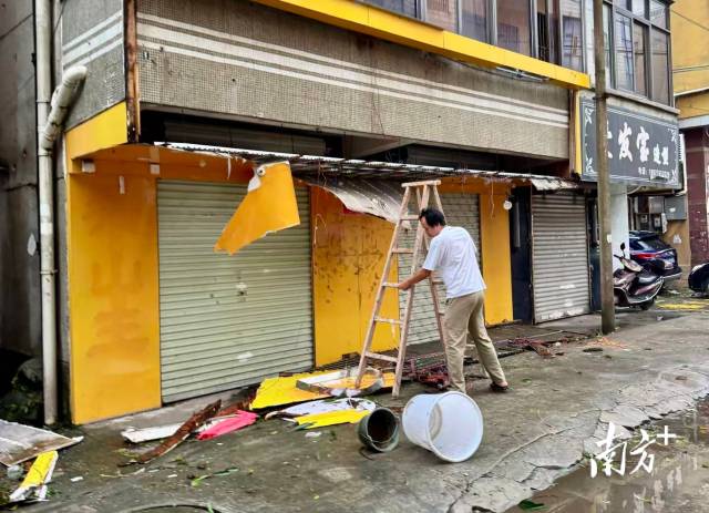 但风雨刚歇,这座县城的生命力便开始涌动。早上7时许,一家诊所门前已基本清理完毕,医护人员正仔细扫除最后几片残叶。沿街可见拿着工具清理断枝的居民,也有商铺店主们修补被狂风损坏的招牌。