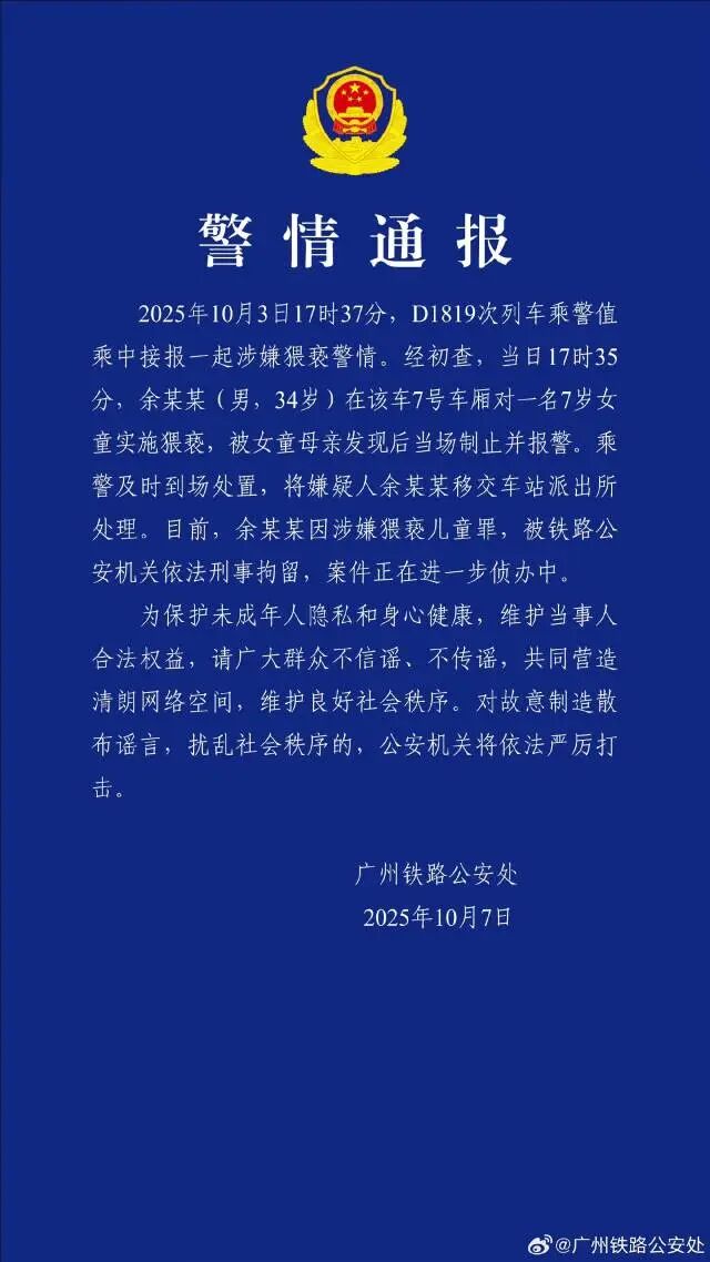 10月3日17时37分,D1819次列车乘警值乘中接报一起涉嫌猥亵警情。经初查,当日17时35分,余某某(男,34岁)在该车7号车厢对一名7岁女童实施猥亵,被女童母亲发现后当场制止并报警。乘警及时到场处置,将嫌疑人余某某移交车站派出所处理。目前,余某某因涉嫌猥亵儿童罪,被铁路公安机关依法刑事拘留,案件正在进一步侦办中。