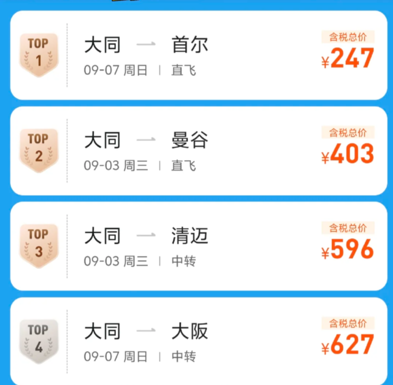 暑期,大同云冈机场推出一批特价出境机票,299元飞韩国、599元飞俄罗斯,就连从大湾区飞来大同的机票,价格也稳定在200-300元区间。