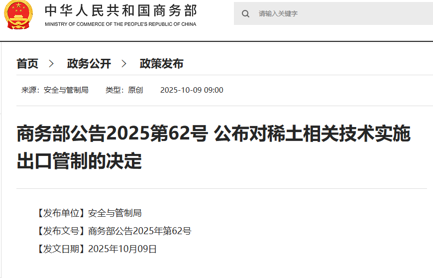 商务部公布对稀土相关技术实施出口管制的决定
