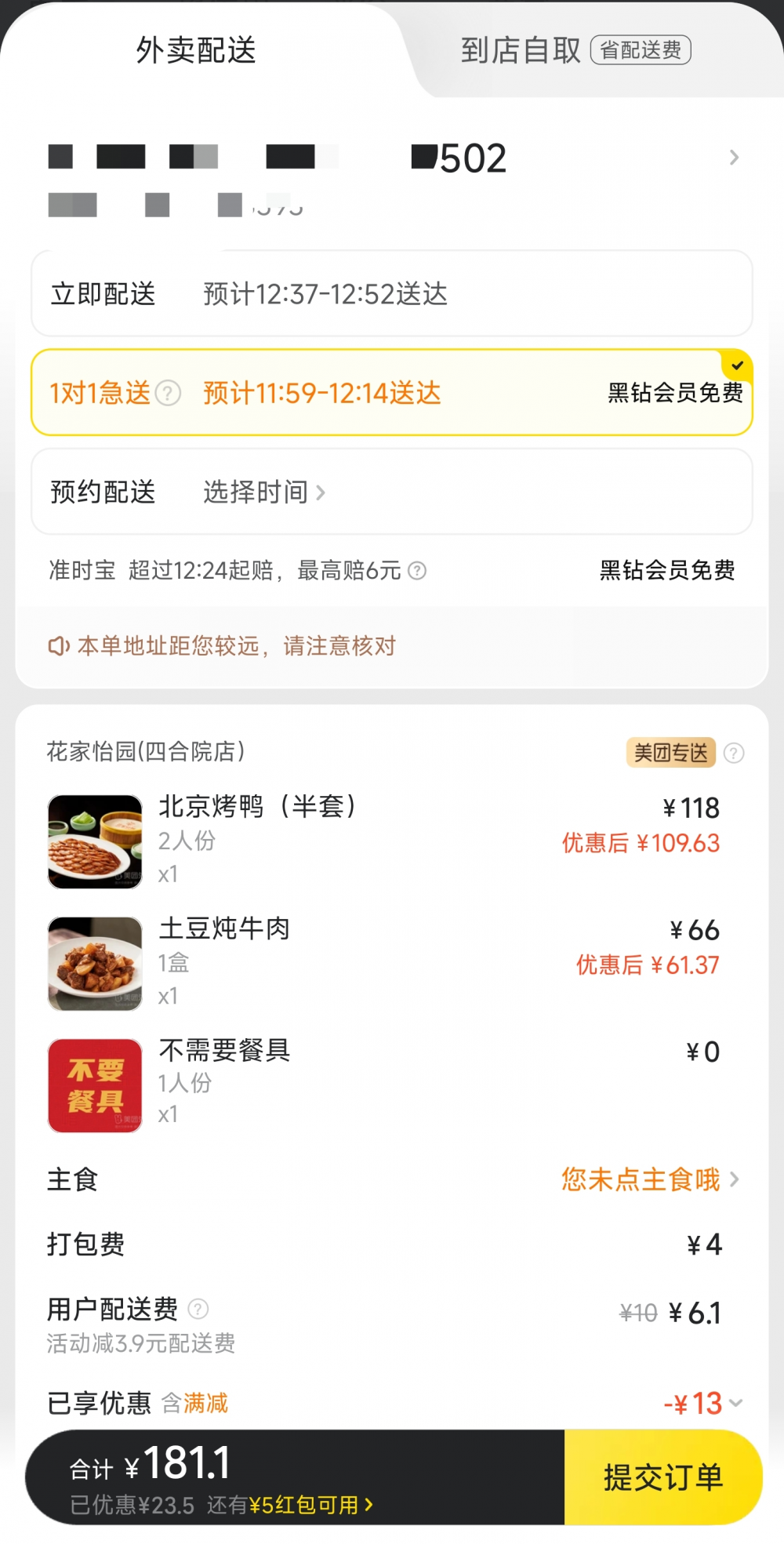 ▲黑钻会员每月可享2次免费“1对1急送”服务。图源:美团App
