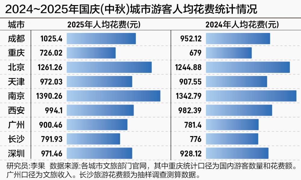 在9座公布游客花费数据的城市中,2025年国庆中秋假期人均花费超1000元的城市从2024年国庆假期的2座(北京、南京)增加1座(成都),其余6座城市尚低于1000元。但所有城市的游客人均花费较2024年同期都出现明显增长,这是各个城市文旅消费供给能力不断增强的客观展现。