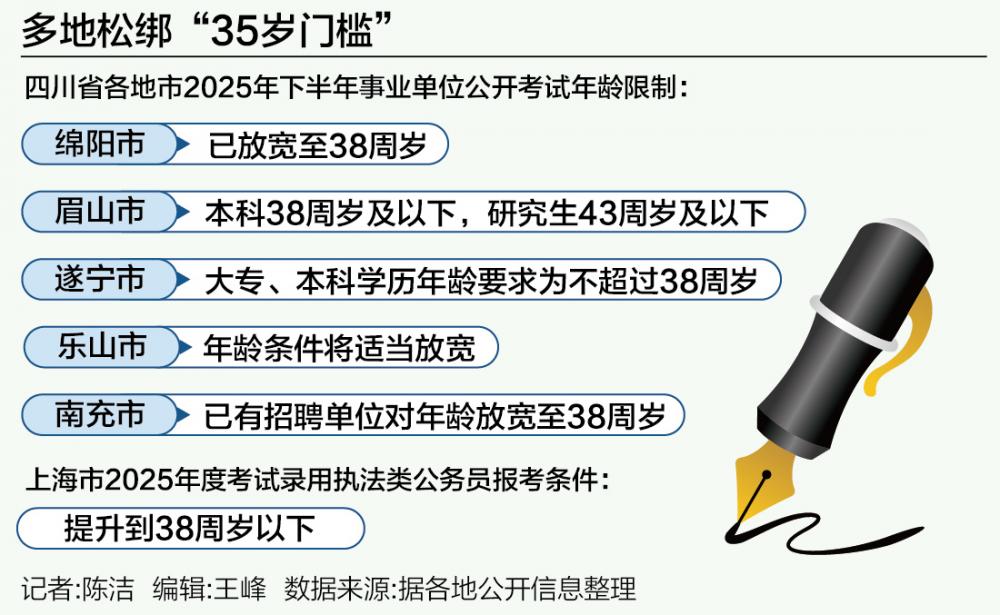 以四川为例,除了绵阳明确2025年下半年事业单位公开考试招聘年龄放宽,还有多地也明确将放宽年龄限制。