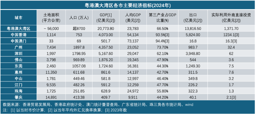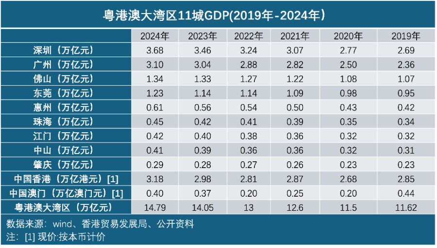 在此基础上,2024年粤港澳大湾区国内生产总值达约14.79万亿元,其中内地九市115365.14亿元,同比增长3.7%,香港31769.93亿港元,同比增长2.5%,澳门4033.14亿澳门元,同比增长8.8%。