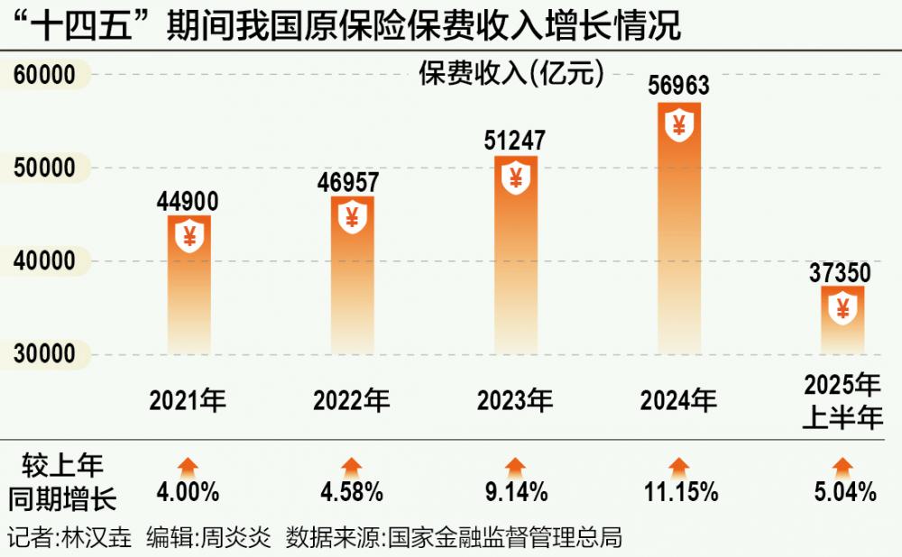 国家金融监管总局数据显示,2021—2024年我国原保险保费收入分别达44900亿元、46957亿元、51247亿元、56963亿元,同比增速从4.0%逐步提升至11.15%,分别为4.0%、4.58%、9.14%、11.15%;2025年上半年,保险业保费收入延续增长势头,合计达37350亿元,较2024年同期增长5.04%。
