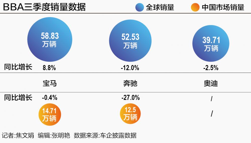 相比之下,奔驰和奥迪则面临着更大的销量压力。梅赛德斯-奔驰集团第三季度全球销量为52.53万辆,同比、环比分别下滑12%、4%;其前三季度累计销量为160.16万辆,同比减少9%。