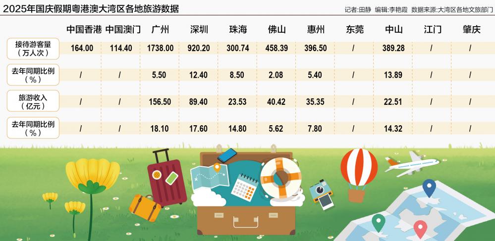 10月1日至8日,2025年国庆中秋双节8天超长假期落幕,粤港澳大湾区文旅消费市场交出精彩答卷。大湾区各城市陆续公布相关数据,广州、深圳、佛山、惠州、珠海、中山等多地接待游客人次与旅游收入均实现显著增长,文旅融合持续深化,国际客源市场与“体育+旅游”新业态成为拉动消费的强劲新引擎。