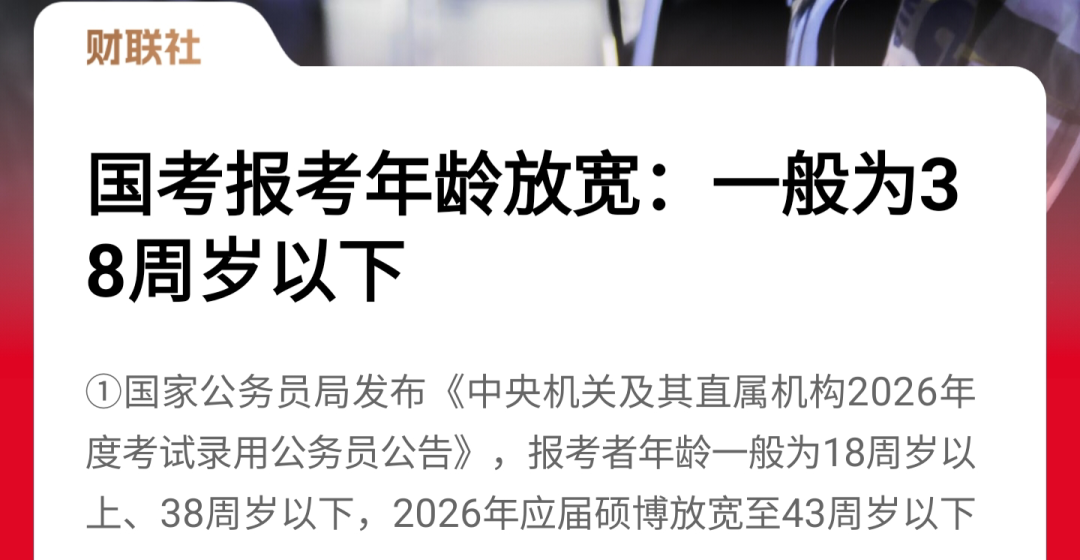 刚刚,2026年国家公务员招录公告发布,年龄上限从35岁放宽到38岁,应届硕士、博士生放宽到43岁。