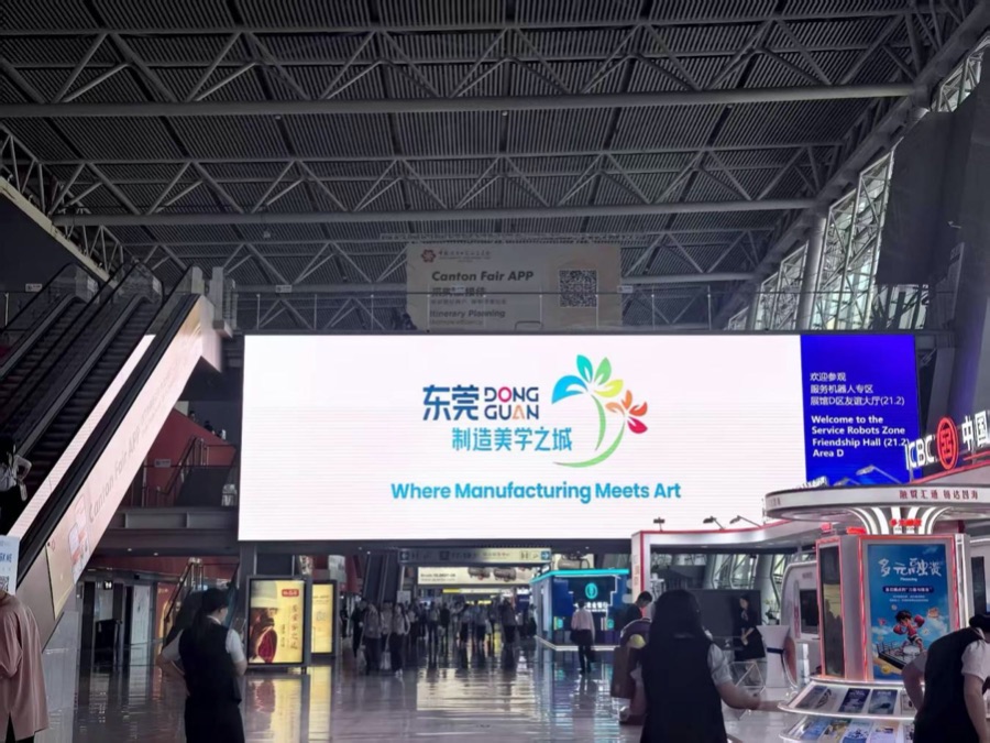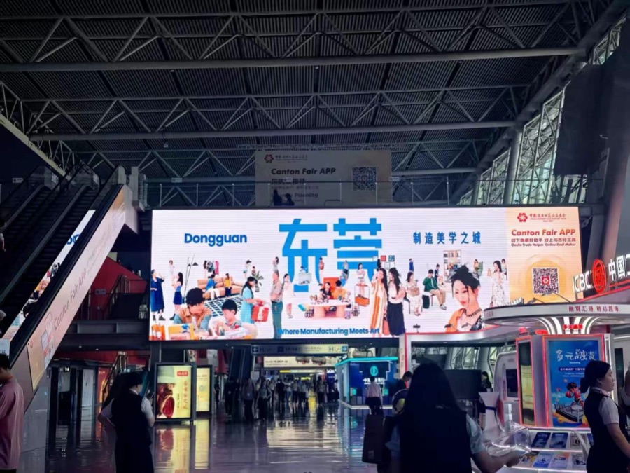 除了企业以“美”为媒,东莞还通过动态视频、静态画面结合的方式,在广交会布局多处核心广告位,展现东莞产品“实用与美学并重”的特色。