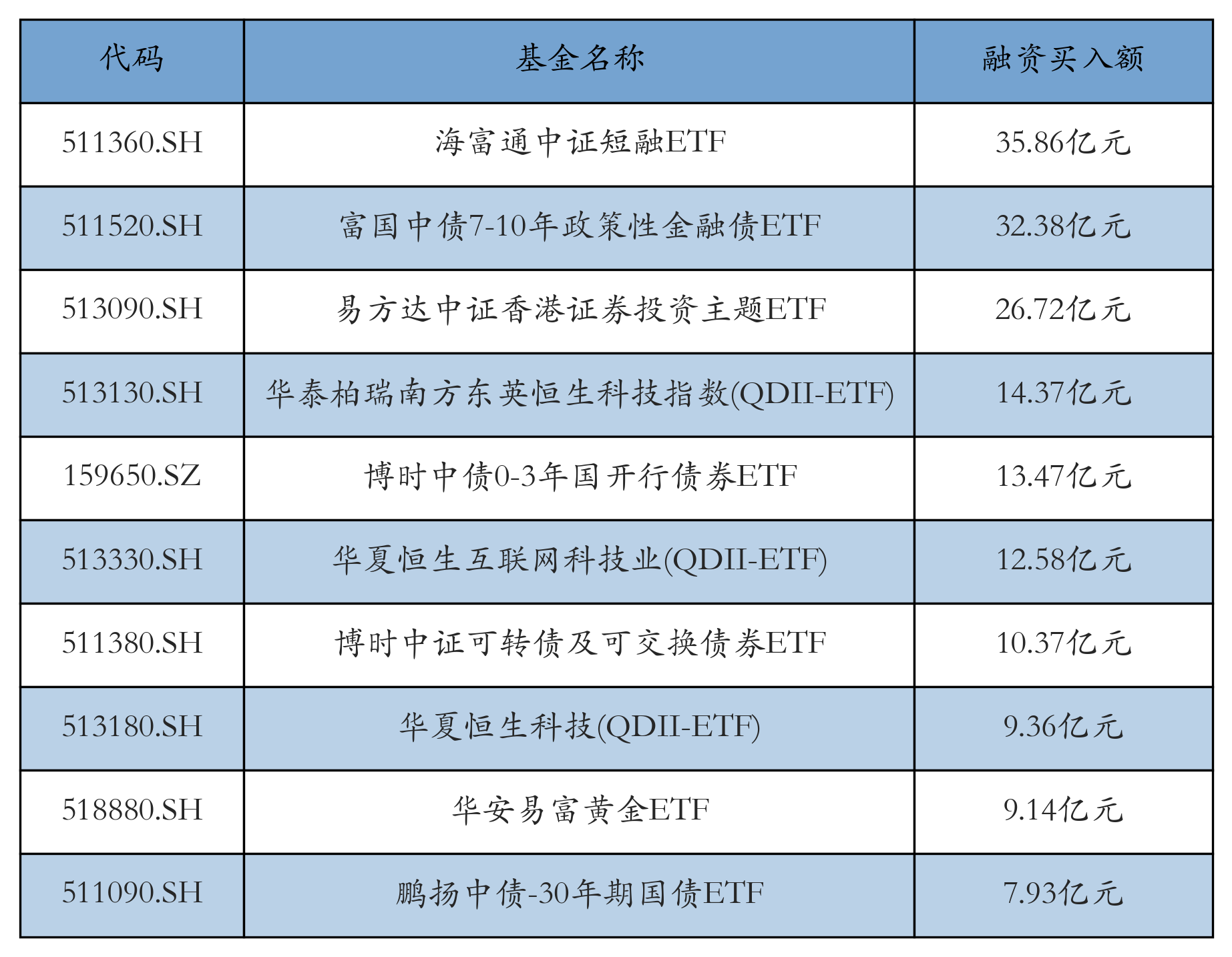 10月15日ETF融资买入额前三位分别为:海富通中证短融ETF(35.86亿元)、富国中债7-10年政策性金融债ETF(32.38亿元)和易方达中证香港证券投资主题ETF(26.72亿元),前10具体见下表: