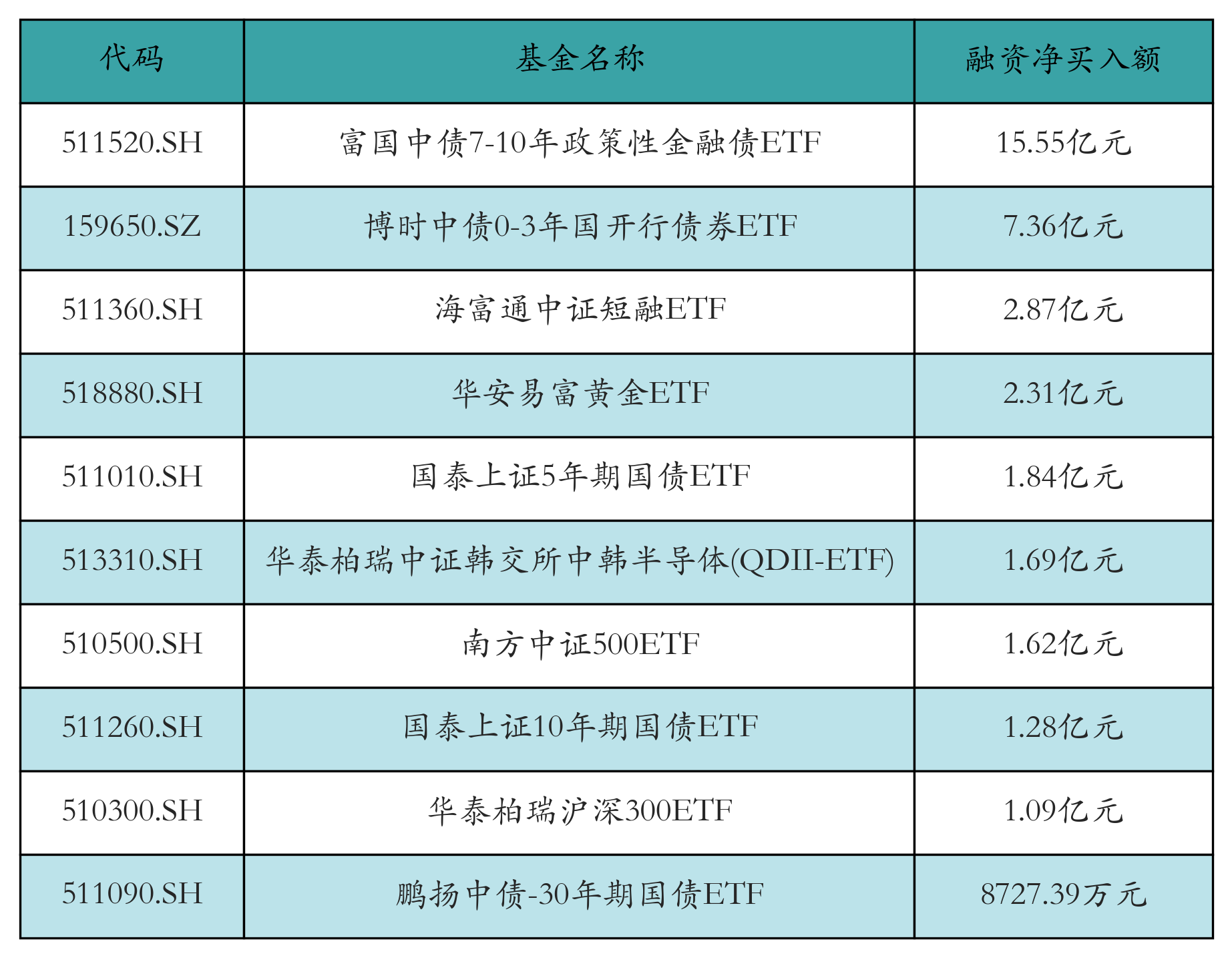 10月15日ETF融资净买入额前三位分别为:富国中债7-10年政策性金融债ETF(15.55亿元)、博时中债0-3年国开行债券ETF(7.36亿元)和海富通中证短融ETF(2.87亿元),前10具体见下表: