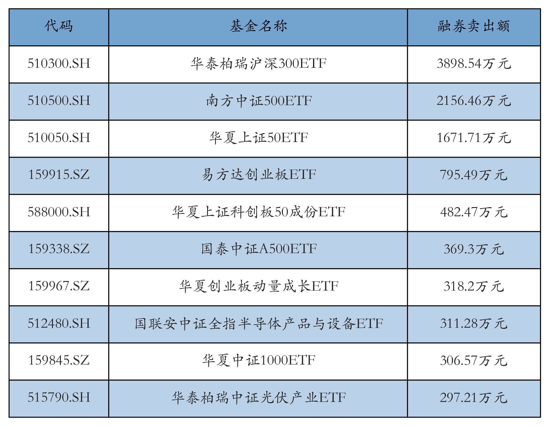 10月15日ETF融券卖出额前三位分别为:华泰柏瑞沪深300ETF(3898.54万元)、南方中证500ETF(2156.46万元)和华夏上证50ETF(1671.71万元),前10具体见下表: