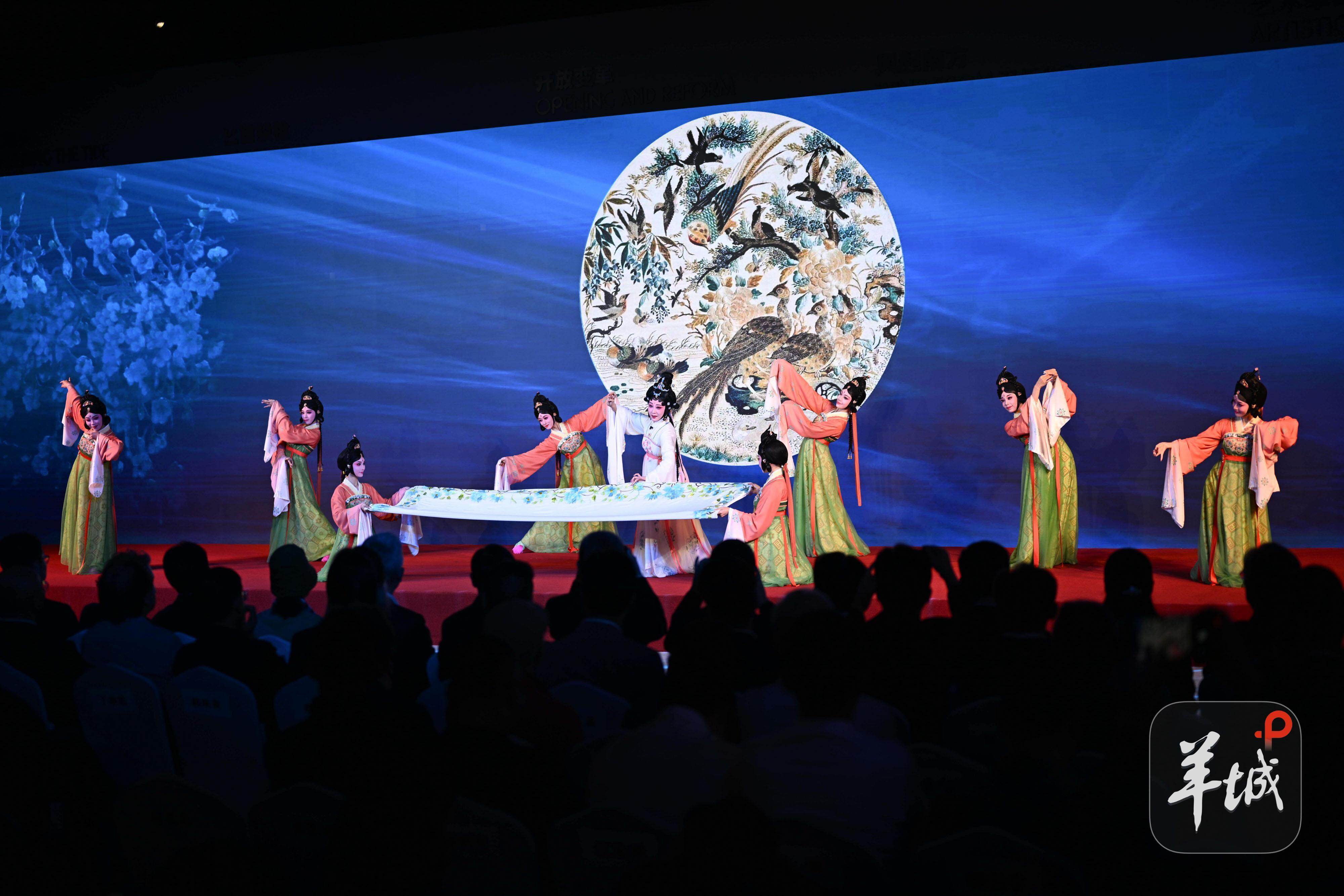 开幕式现场,粤剧《双绣缘》选段展演“惊艳”四座。剧目以婉转唱腔诠释唐代人纯真、洒脱的情感观,融入传统广绣艺术与中国古典舞蹈语汇,展现粤剧与广绣两大非遗艺术的跨时空共鸣。