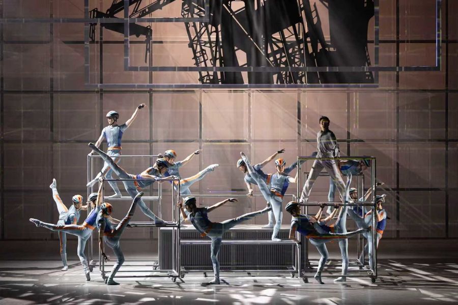 男女主人公的表演,芭蕾意味更浓,着重体现在两段精心编织的双人舞:第一段依托“双湾区对话”的意境,层层铺展出男女主人公的内心情愫。演员情感细腻,动作配合丝丝入扣,“对话式”双人舞有如聆听一段精彩的话剧对白,于你来我往一招一式间,将心理逻辑交代得十分清晰;另一段则以美丽珠江为背景,把“水滴汇入江河,流淌出生命旋律”的内涵表现得深切动人,从技术娴熟、大开大阖的表演中,观众不仅看到了人物精神的升华,也充分感受到寇祖权、欧嘉媛两位年轻主演的表演才华。有序铺排各色“表演性”舞蹈成为该剧另一亮点,“福瑞双人舞”的热烈俏皮,“机器人舞”的新颖独到,以及“木棉花舞”的抒情唯美都给观众留下了深刻印象。值得一提的是,男舞者群体在剧中展现出良好的专业素养,无论是肢体的力量感,还是“脚下”的严谨规范,都达到国内舞团较为理想的水平。这支经过《浩然铁军》《旗帜》等现代芭蕾舞剧淬炼的男舞者队伍,让剧院的整体表演实力为之提升。