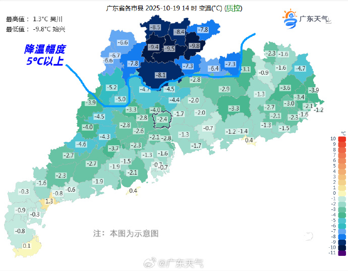 据广东天气,10月19日,冷空气已覆盖粤北,降温幅度达5℃以上,部分地区降温近10℃。