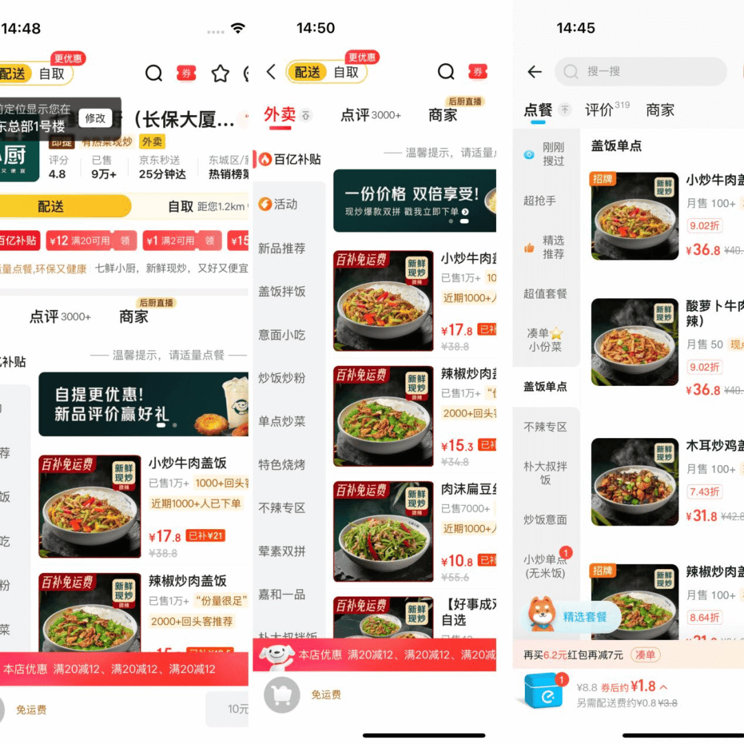 比如近期京东七鲜小厨宣布入驻美团、饿了么,作为京东自营的品质餐饮制作平台,七鲜小厨背后集结了大厨、朴大叔拌饭等知名餐饮品牌,但此前只在京东外卖平台独家销售。