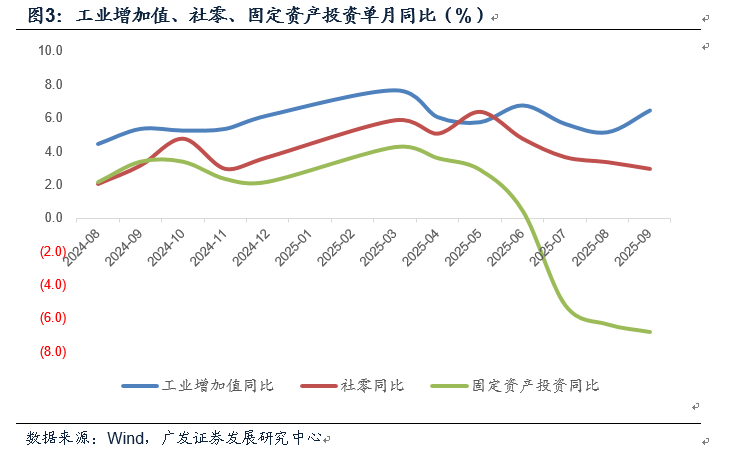 从主要经济指标来看,9月工业增加值同比6.5%(前值5.2%);服务业生产指数同比5.6%(前值5.6%);出口同比8.3%(前值4.3%);社零单月同比3.0%(前值3.4%)。